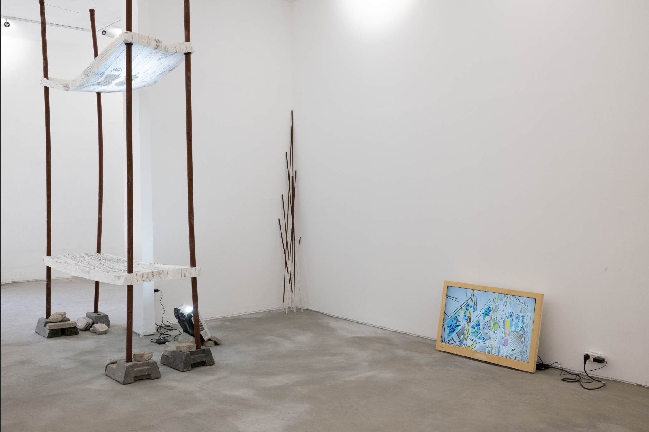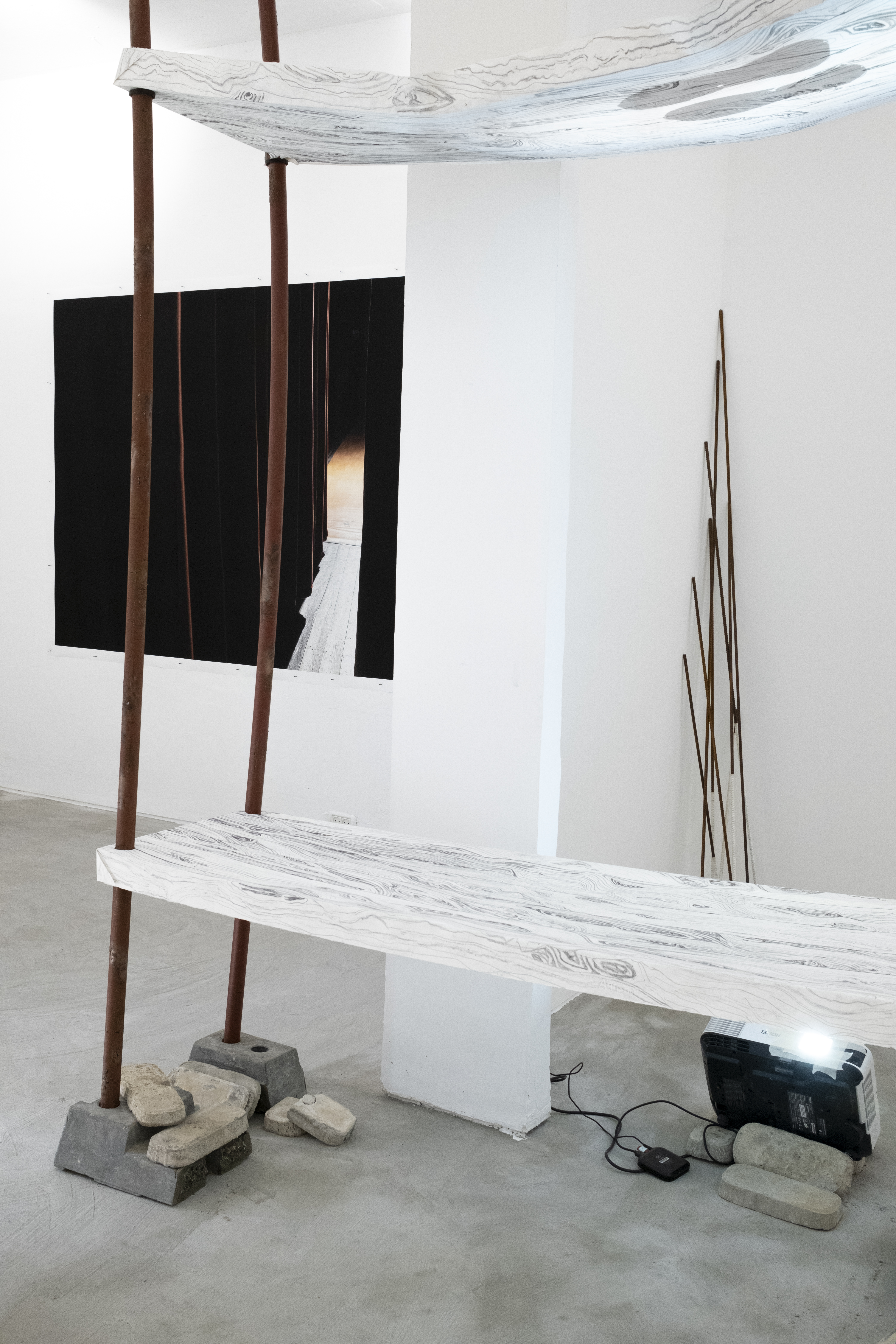 “Scaffolding”, paper, grafit, plastic tubes, video insallation